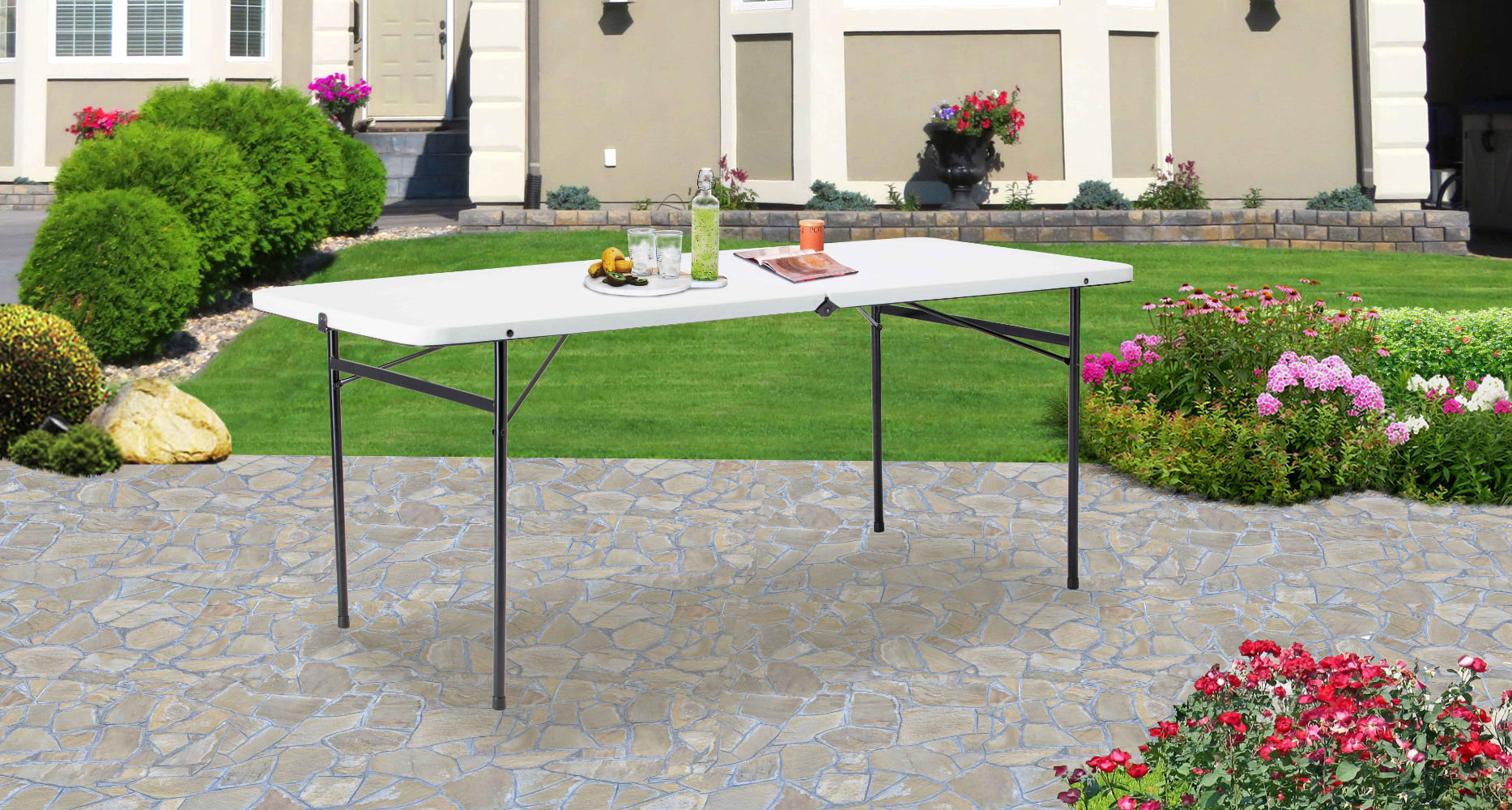 6 Foot Bi-Fold Plastic Folding Table, White Picnic Table Camping Table Set Camping Table Foldable
